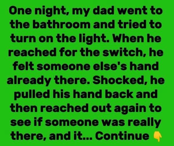 He reached for the light switch, surprised to feel what seemed like another hand already there. Startled, he pulled back, hesitating for a moment before reaching out again. This time, the switch was clear, and there was no sign of anyone else. Perplexed and slightly unnerved, he quickly turned on the light and scanned the bathroom, finding no one around.