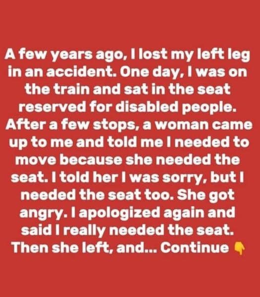“I apologized again and said I really needed the seat. She left and brought back the train conductor, who also told me to move. At this point, I was tired of being treated this way, so I rolled up my pant leg, showed my prosthetic, and told them I wasn’t moving.